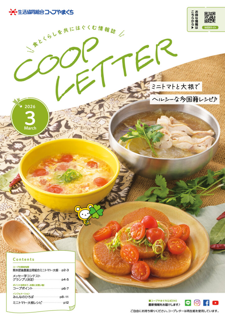2026.02.23 コープレター2026年3月号を更新しました 広報誌 コープやまぐちの機関紙「コープレター」をご紹介。食とくらしに関するお役立ち情報や取り組み内容を掲載しています。ぜひご覧ください! \コープポイントゲットのチャンス!/ アンケートのご回答はこちらから 目次 ●コープの美味旬菜「肥後農産のミニトマト・大根」 ●メッセ―字コンテスト グランプリ決定! ●コープポイント ●みんなのひろば ●れんこんレシピ紹介 ↓ クリックで電子ブックが開きます ↓ 前のニュースへ 次のニュースへ ニュース一覧に戻る