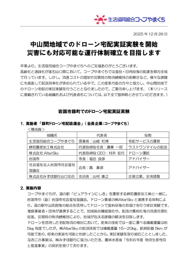 高齢化と過疎化が進む山口県において、コープやまぐちでは食品・日用品等の配達を県内全域で行っております(ここくる)。しかし、流通コストの増加や災害時の物流網維持の困難さなど、様々な課題にも直面して配送効率化が求められている中で、この度多方面の方々と協力し、中山間地区(岩国市錦町)でのドローン宅配の実証実験を行うこととなりました。