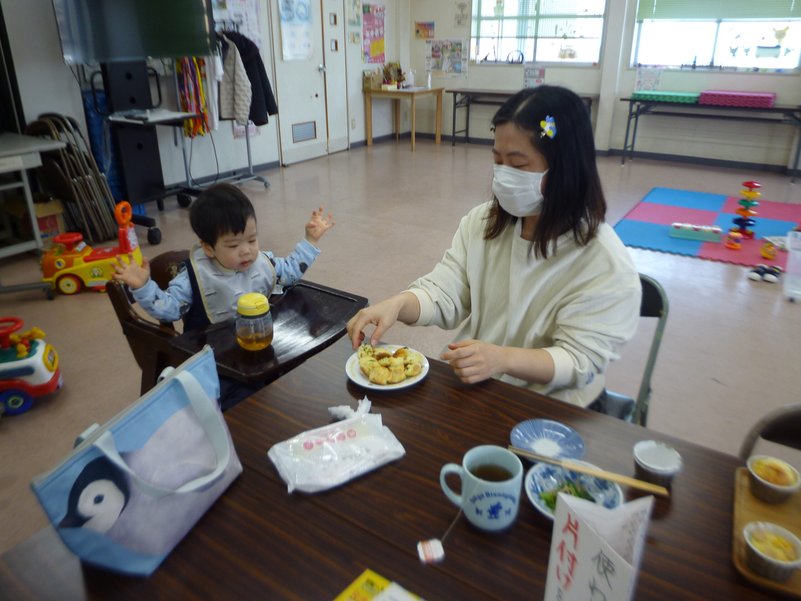 1組だけだったので、アットホームな感じで私たちもゆっくりしました。バランスキューブを使ったスープで、離乳食・幼児用・大人用と作り分けをして食べました。バランスキューブを使用したので野菜の味が感じられてとても美味しかったです!インフルエンザも大流行しているので、参加者も少なかったのかなと思います。