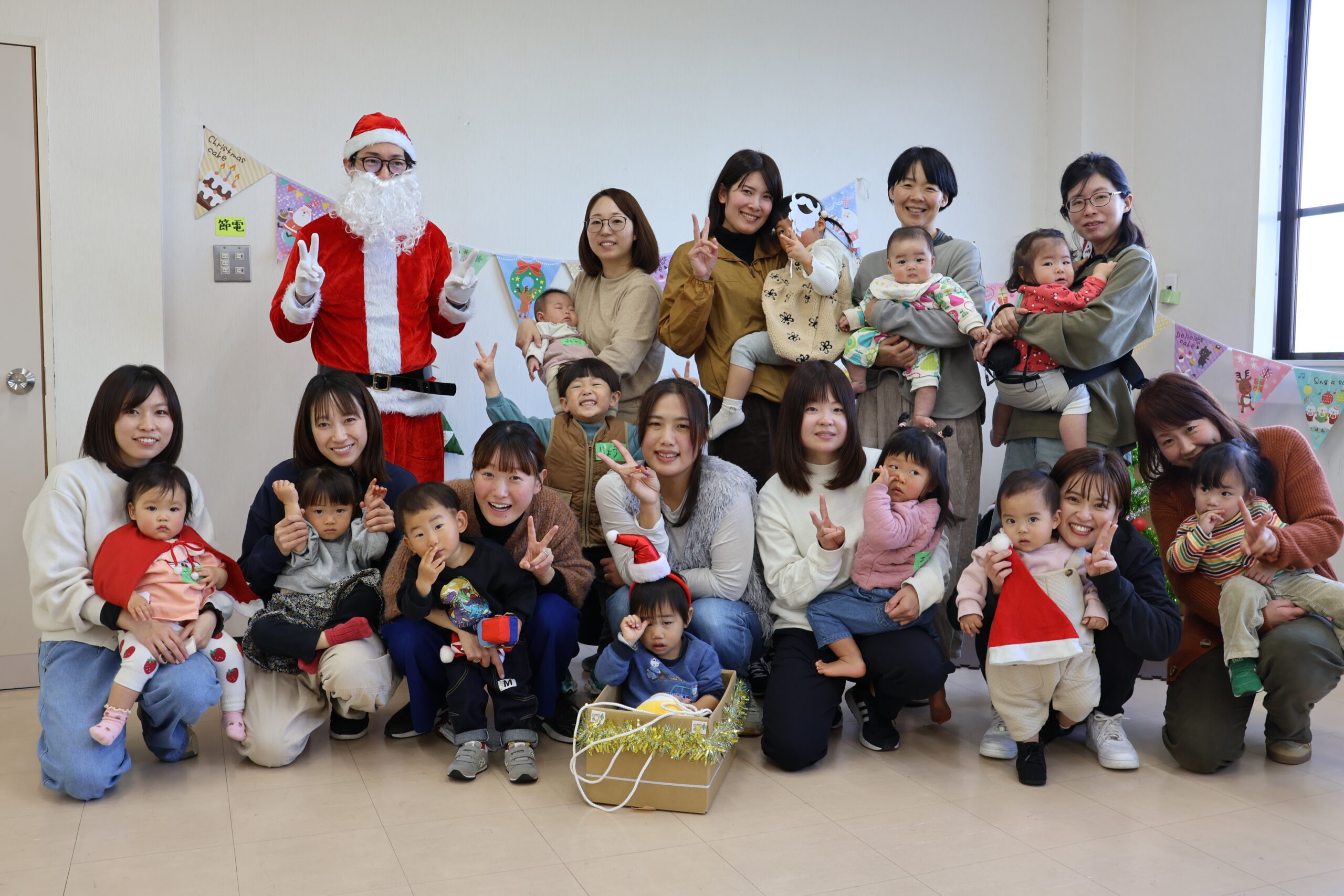 今月はクリスマス会でした。「きいろいひよこ」さんに来ていただき、パネルシアター、エプロンシアター、読み聞かせ等、子ども達を飽きさせない出し物でとても良かったです。昼食にカレーライスを準備してみんなで頂きました。サンタからのプレゼントもあり、子ども達は大喜びでした。今日は当日欠席が1組のみで、たくさんの参加がありました。来月のお知らせを皆さんに渡したので、また1月もたくさんの参加があるといいなと思います。