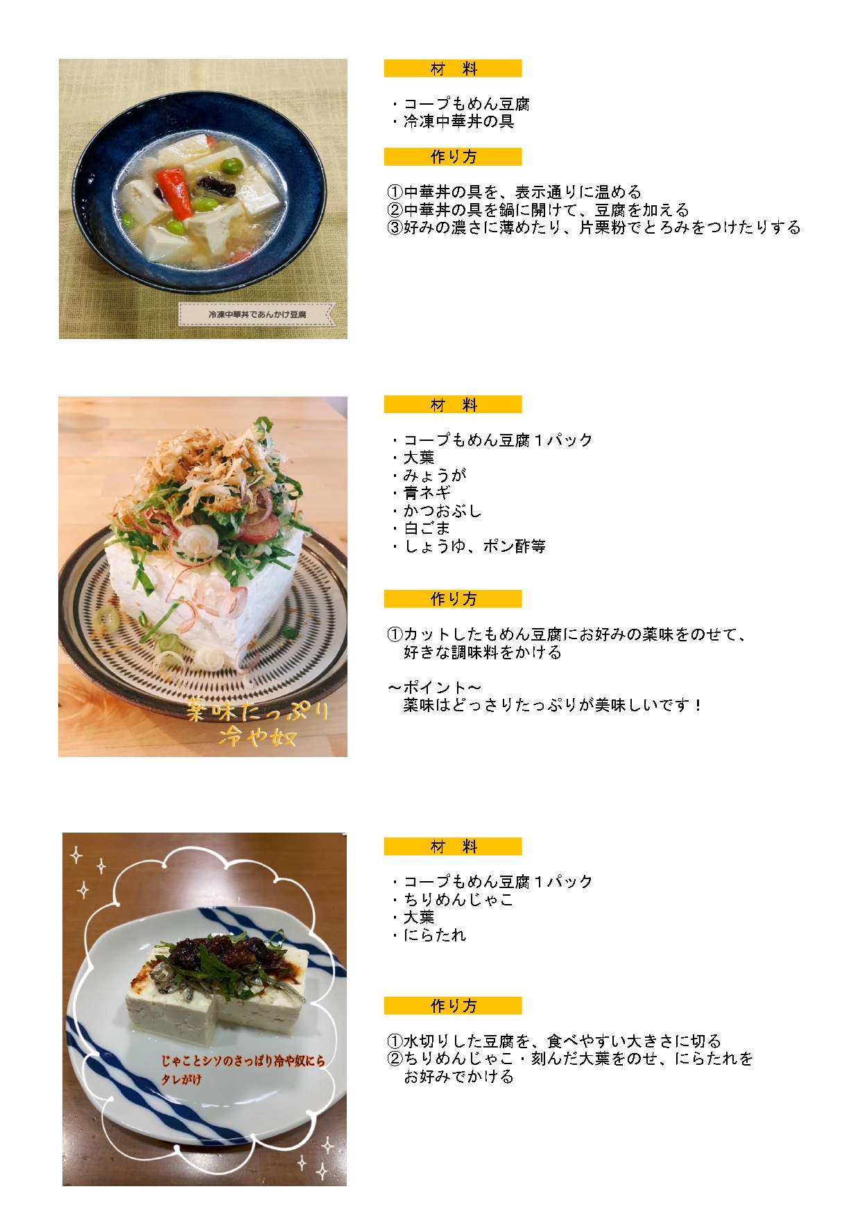 2022.03.21 周南地域より「もめん豆腐」レシピのご紹介です♪ 組合員活動 周南地域では、2021年度の地域のいちおし商品「コープもめん豆腐」を使って簡単に作れる料理をつくってきました。レシピをご紹介しますので皆さんもぜひ作ってみてくださいね (^o^)/💞 PDF版はこちら 前のニュースへ 次のニュースへ ニュース一覧に戻る