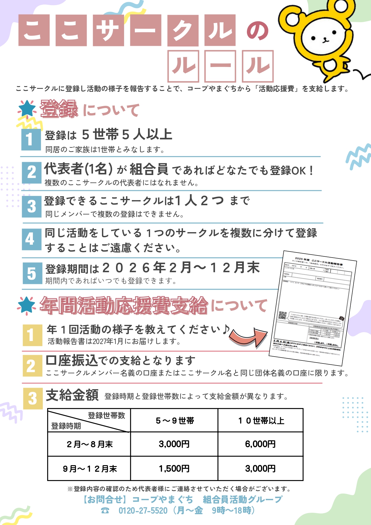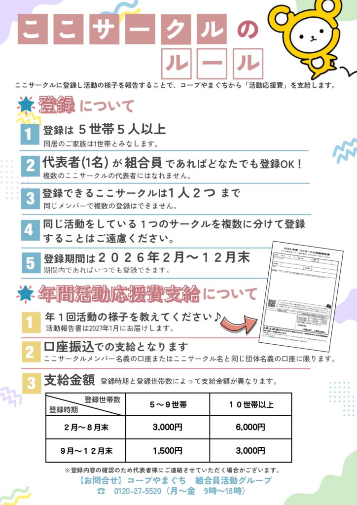 ここサークルに登録し年に1回活動を報告することで、コープやまぐちから活動補助費を受け取ることができます。