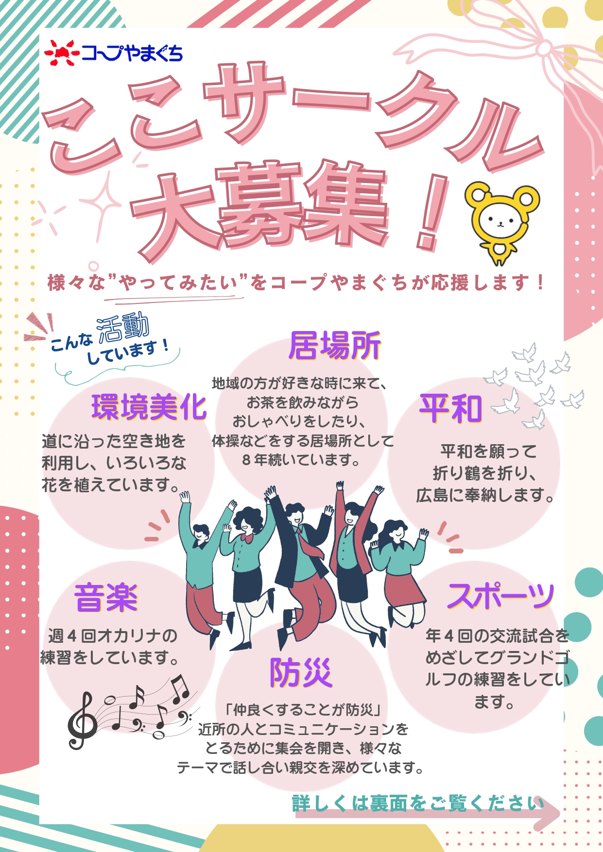 組合員活動コープやまぐちでは、地域の人と人とのつながりづくり、そしてみなさまの「やってみたい」気持ちを応援する「ここサークル」活動に取り組んでいます。「ここサークル」とは、組合員を含む、5世帯5人以上で地域を問わず、自分たちの好きな興味や関心をテーマに自由に活動できるグループです。