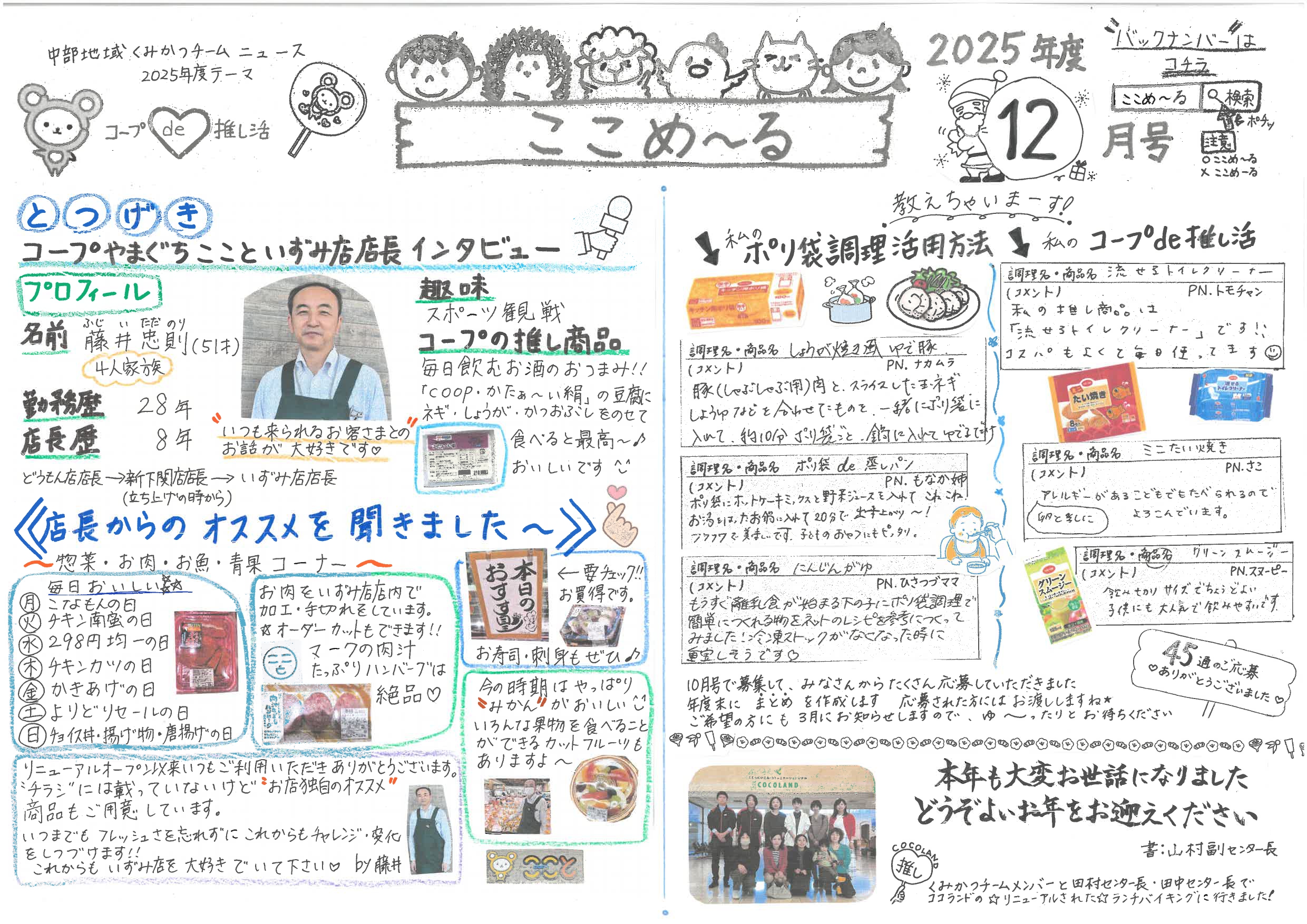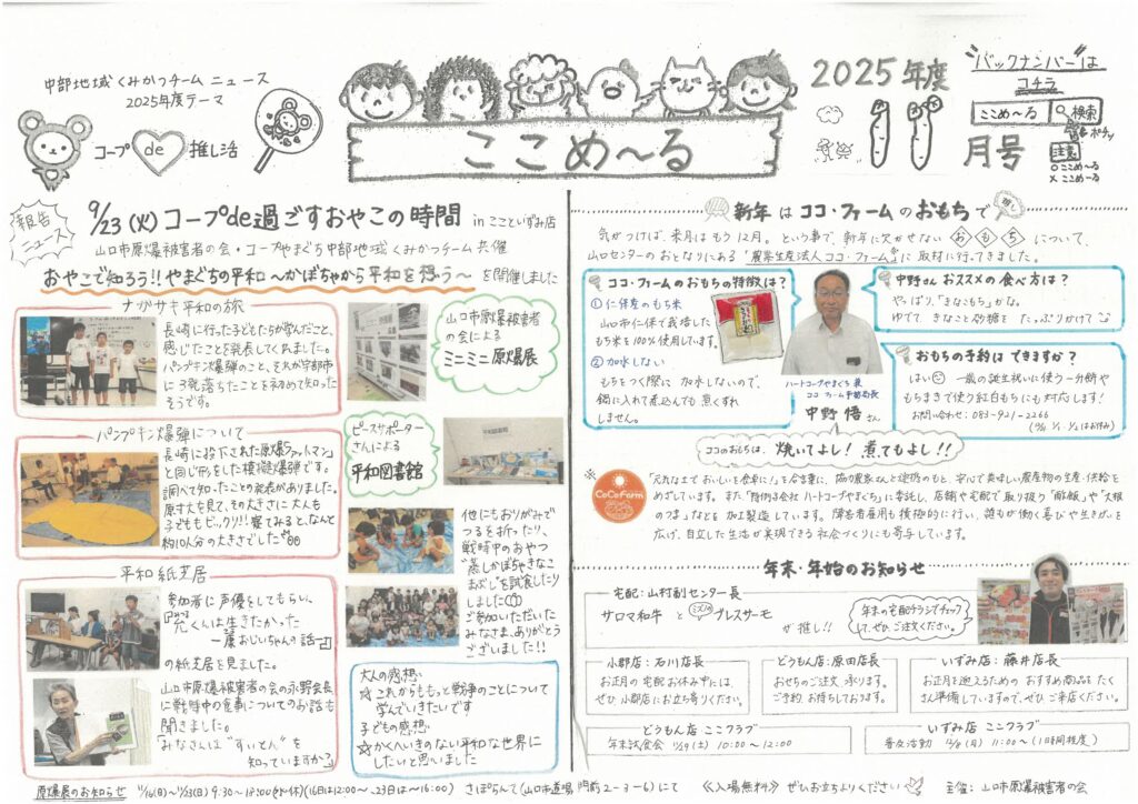 組合員活動宅配でお配りしている、中部地域(山口市・防府市)地域組織委員会ニュース「ここめ~る」のバックナンバーです。ぜひご覧ください♪