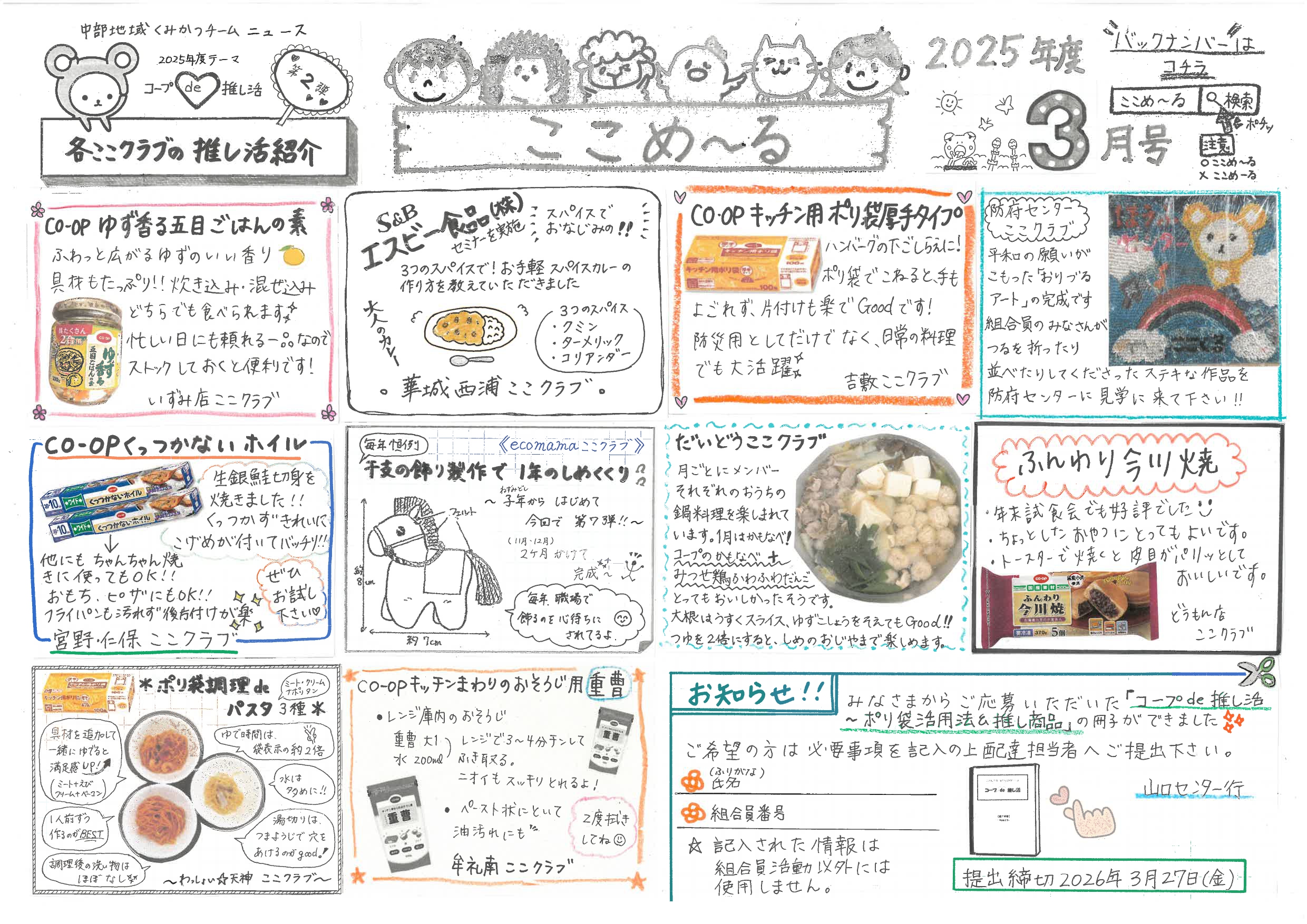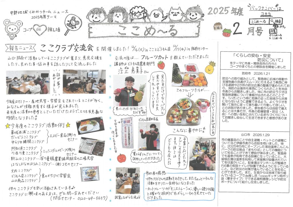 組合員活動宅配でお配りしている、中部地域(山口市・防府市)くみかつチームニュース「ここめ~る」のバックナンバーです。ぜひご覧ください♪